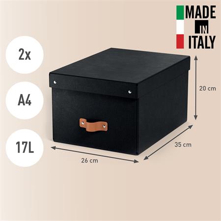 Súprava dvoch stredne veľkých úložných boxov s vekom vyrobených zo 100% recyklovanej lepenky s certifikátom FSC v modernom a čistom dizajne, ktorý doplní vašu domácnosť aj kanceláriu.