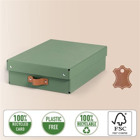 Súprava dvoch stredne veľkých nízkych úložných boxov s vekom vyrobených zo 100% recyklovanej lepenky s certifikátom FSC v modernom a čistom dizajne, ktorý doplní vašu domácnosť aj kanceláriu.