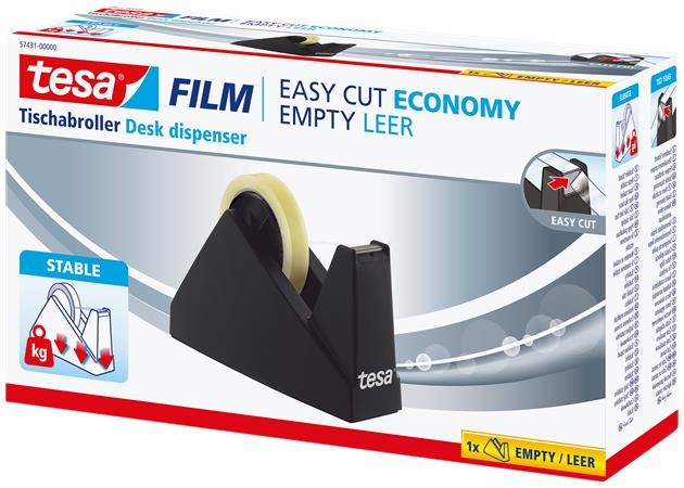 Stolový dispenzor tesa® Easy Cut Economy je klasický dispenzor na lepiace pásky, pre domáce a kancelárske použitie. Podrží akúkoľvek lepiacu alebo baliacu pásku poskytnutú na jadre s veľkosťou 3". Vhodná k akejkoľvek baliacej páske so šírkou 25 mm a dĺžkou 66 m. Vďaka protišmykového spodku ľahko a rýchlo sa dá používať.
