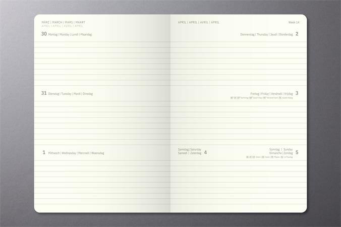 -týždenné rozvrhnutie (2 strany = 1 týždeň) -mesačný a ročný plánovač na roky 2026/2027 -gumička na uzatváranie -držiak na pero na bočnej strane -vnútorné rohové vrecko a archivačné púzdro -s označovacou páskou -s mapou sveta - s tabuľkou veľkostí -papier chamois, 80 g/m² -v zadnej časti perforované  listy na poznámky -s nálepkami -rozmery: 148x213x20 mm -jazyk: DE/ENG/FR/NL