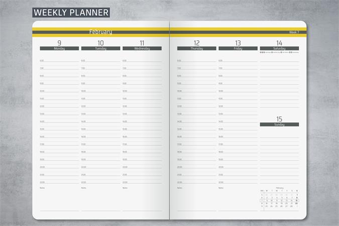 -týždenné rozvrhnutie (2 strany = 1 týždeň) -mesačný a ročný plánovač na roky 2026/2027 -linajkové listy -s označovacou páskou -zapínanie na gumičku -na boku držiak na pero  -80 g/m2 papier -rozmery: 148 x 213 x 16 mm -jazyk: DE/ENG/FR/NL