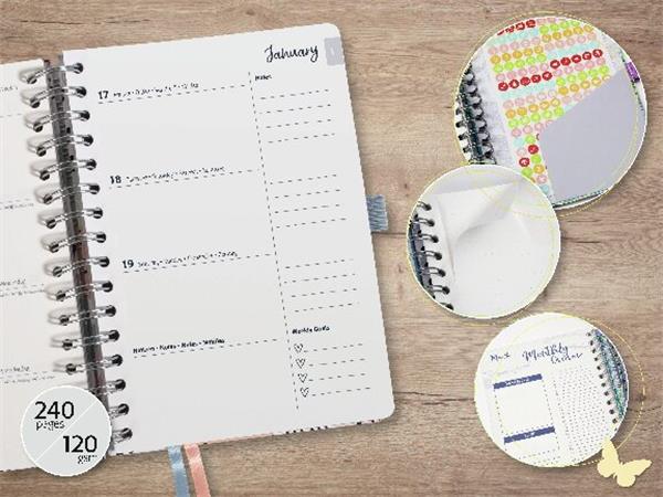 -týždenné rozvrhnutie (2 strany = 1 týždeň) -mesačný a ročný plánovač na roky 2026/2027 -s plánovačom narodenín a darčekov -s mapou sveta -so zoznamom úloh -s nálepkami "ikonky"
