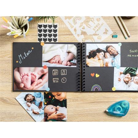 Súprava obsahuje: -scrapbook -12 metalických popisovačov špeciálne určených na čierny papier -2 hárky pastelových nálepiek (230 ks) -2 hárky zlatých nálepiek (75 ks) -2 šablóny -48 rámikov na fotografie