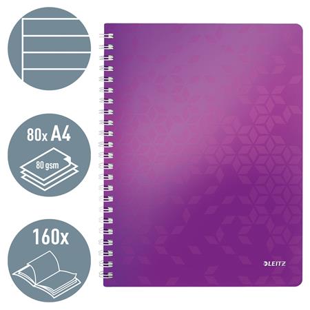 Špirálový zošit, A4, linajkový, 80 listov, LEITZ "Wow", fialový