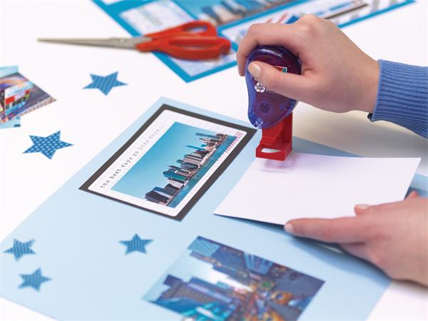 Lepiace razítko tesa® na pripevnenie fotografií, poznámok alebo ľahkých predmetov na papier či lepenku. Toto ekologicky šetrné lepiace razítko je i zábavné.