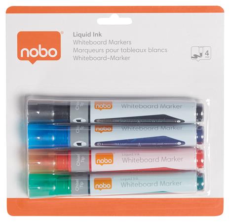 Popisovače na tabule, určené na každodenné použitie, ponúkajú všestranné možnosti pre neporézne povrchy - napr. biele, sklenené alebo smaltované tabule. Použite na tabuľách Nobo pre optimálny výkon! - rýchloschnúci atrament - možno nasucho stierať -množstvo atramentu je možné sledovať cez okienko na tele pera - ideálne do školy, kancelárie alebo domácnosti - žiarivé farby - zrezaný hrot - hrúbka: 4 mm - balenie: 4 ks