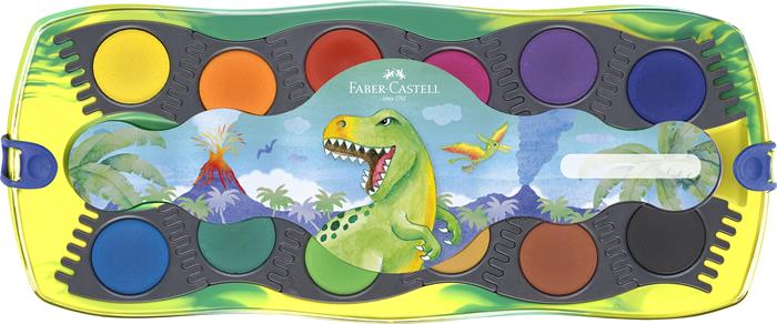 Vodové farby, 12-kusové, skladacie, FABER-CASTELL "Dinosaurus" + 1 tuba bielej temperovej farby + nálepky dinosaura