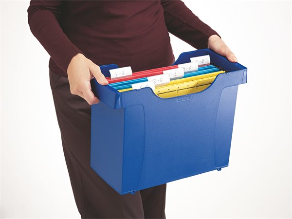 Zásobník na závesné dosky v dizajne radu Leitz PLUS. Vyrobený z pevného plastu. Postranné skryté výrezy na ľahký prenos.