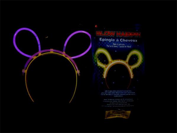 balenie obsahuje žltú čelenku, 3 svietiace tyčinky (náramky) a 3 adaptéry na náramky