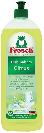Frosch citrusový prostriedok na umývanie riadu s obsahom balzamu žiarivo čistí riad. Výťažok z citrusu je účinným odmasťovačom. Nevysušuje pokožku, pH neutrálny.
