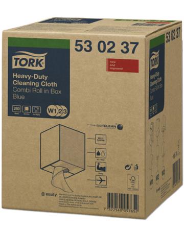 Tork Heavy-Duty viacúčelová čistiaca utierka je vysoko absorpčná, hrubá a veľmi odolná, pričom vydrží silné utieranie bez toho, aby sa rozpadla. Možno ju použiť s väčšinou rozpúšťadiel, pričom rýchlo a účinne odstraňuje olej, mastnotu, vodu a odolné škvrny, zároveň chráni ruky pred vysokou teplotou a poškriabaním o kovové predmety. Túto utierku možno použiť v Tork stojanových zásobníkoch na podlahu či na stenu, ktoré sú vyvinuté na bezpečnosť a účinnosť, prípadne v Tork maxi zásobníkoch so stredovým odvíjaním alebo zásobníkoch na kombi kotúč v boxe, ktoré sú vyvinuté na dávkovanie jednou rukou.