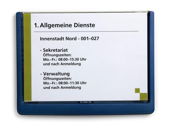 Hlavná stránkaPrevádzka a údržbaPrevádzka a údržbaInformačné znakyInformačná tabuľka, 148,5x210 mm, DURABLE "CLICK SIGN", modrá