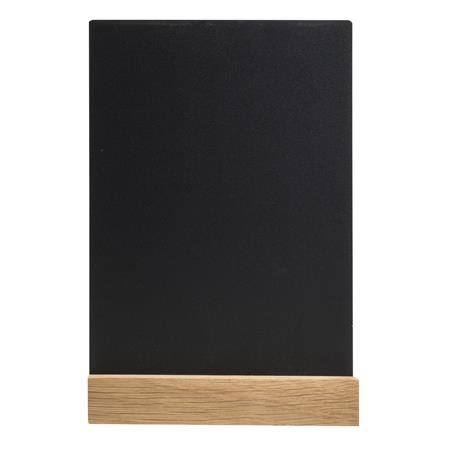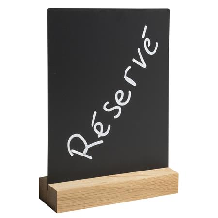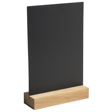 Ideálny na vystavenie jedálnych lístkov, cien či ponúk na stole. -vyrobený z ABS plastu -vhodný na písanie kriedou alebo kriedovým popisovačom -obojstranný -zvislá orientácia -podstavec z dubového dreva -rozmery: 148 x 52 x 210 mm