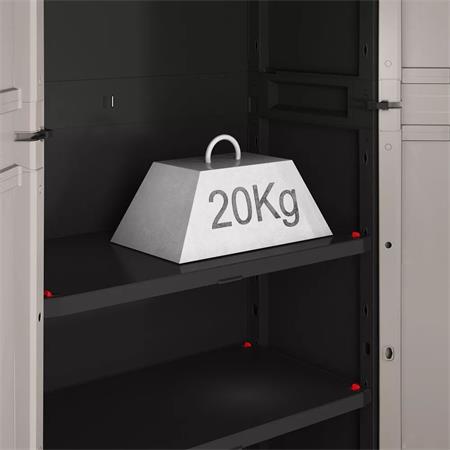 Odolná plastová  skriňa vhodná do garáže, na chatu, na terasu alebo do pivnince. - jednoduchá montáž a údržba - dvere uzamykateľné visiacim zámkom (nie je súčasťou balenia) - 4 nastaviteľné police s nosnosťou 20 kg/polica - nastaviteľné nôžky - s certifikátom TUV GS minősítéssel -rozmery skrine: 68x39x173 cm (šírka x hĺbka x výška) - rozmery políc: 63x33 cm - celková hmotnosť: 14 kg