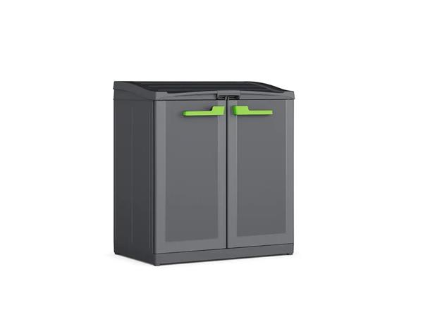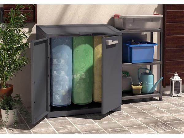 KETER Moby štýlovo a jednoducho prispieva k ochrane životného prostredia.Jeho moderný dizajn sa hodí do exteriéru. -vhodná na uloženie troch vriec s objemom do 110 litrov -vyrobený z polypropylénu -ľahko sa čistí - jednoduchá montáž -má jedno veľké horné veko s push-to-open systémom otvárania, ktorý umožňuje jeho otvorenie jediným pohybom. - predné dvojkrídlové dvierka s pohodlnými úchytkami - s nastaviteľnými nohami -rozmery: 55x90x100 cm (šírka x hĺbka x výška) -hmotnosť: 13,61 kg - vrecia nie sú súčasťou balenia