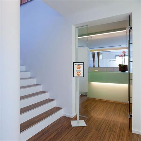 INFO STAND BASIC podlahový stojan je čitateľný z oboch strán, čo ho robí ideálnym na prezentáciu informácií aj ako orientačný a navigačný systém.